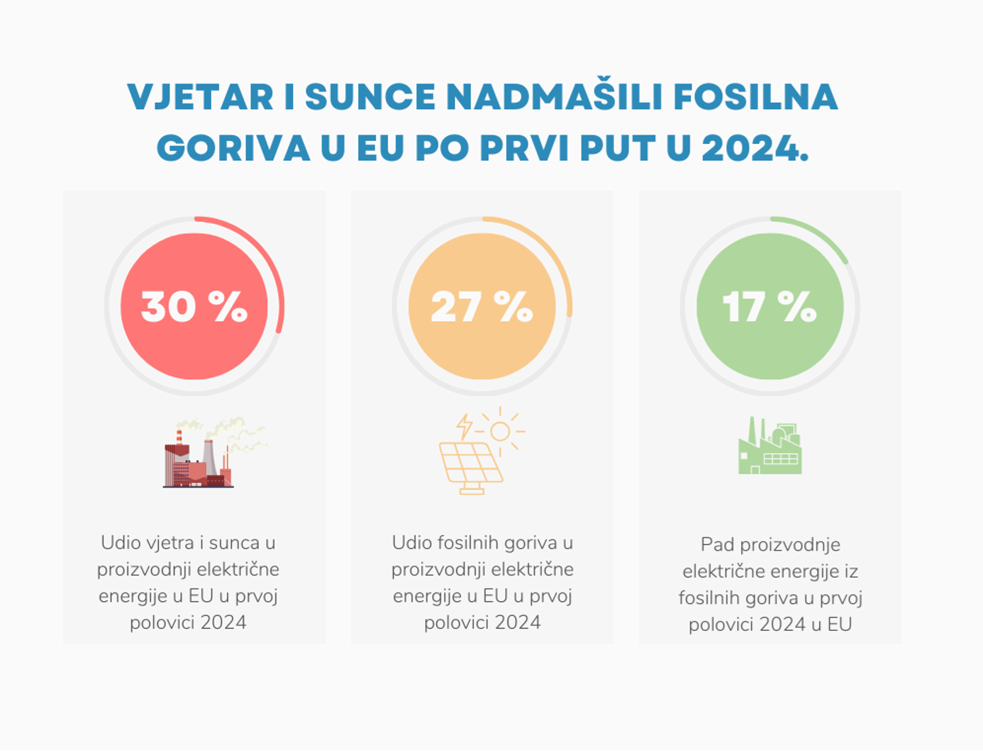 U prvoj polovici 2024. godine, vjetar i sunce po prvi put su nadmašili fosilna goriva u proizvodnji električne energije unutar Europske unije. Prema izvješću britanskog think thanka Ember, vjetar i sunce sada čine 30% ukupne proizvodnje električne energije u EU, dok su fosilna goriva pala na 27%. Ovo predstavlja značajan korak u energetskoj tranziciji EU, pogotovo jer je ukupna potražnja za električnom energijom porasla za 0,7% u odnosu na prethodnu godinu.